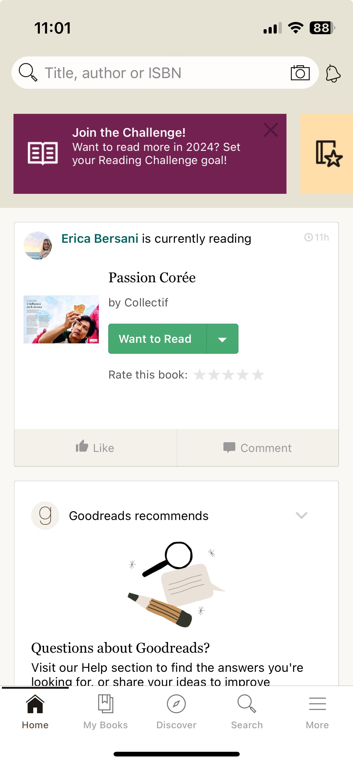 The home page : I decided to highlight more the book challenge part. Indeed, on the screenshot of the current home page (see higher), there’s a card inviting the user to join a book challenge but the fact is I had already setted up a challenge on my profile. So I wanted to make it more visible on the home page so that the user has a reminder of it when they open the app and can get motivated to progress on it. I also integrated a micro interaction on the progression ellipse completion.