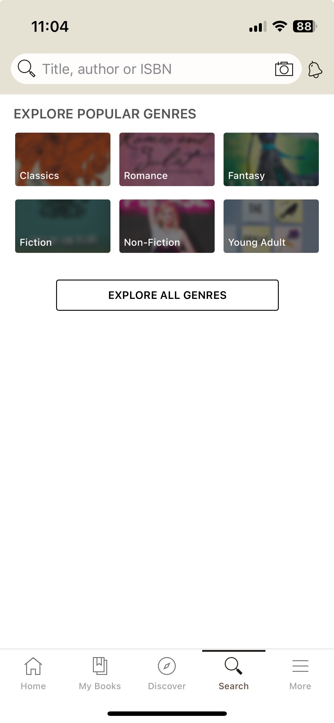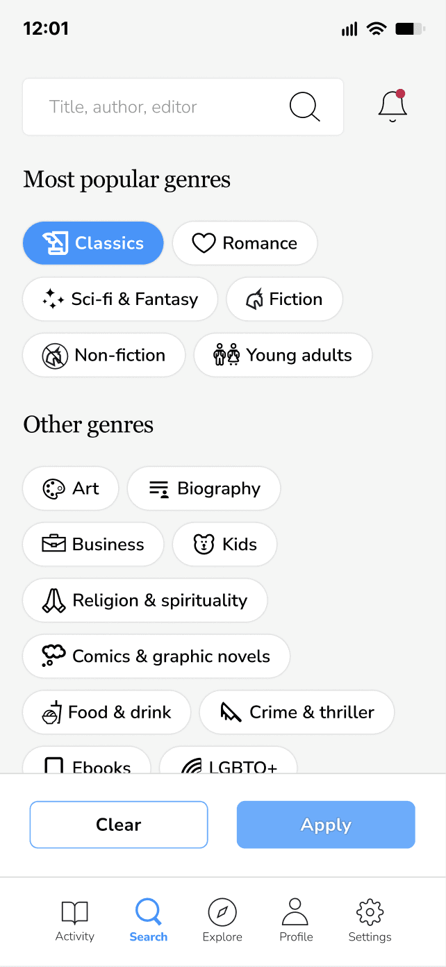 The Search screen needed to be more engaging and I decided to create genre tags with pictos to make it easy to identify, and decided to introduce a filter option so that the user can select several genres and see the corresponding book results.
