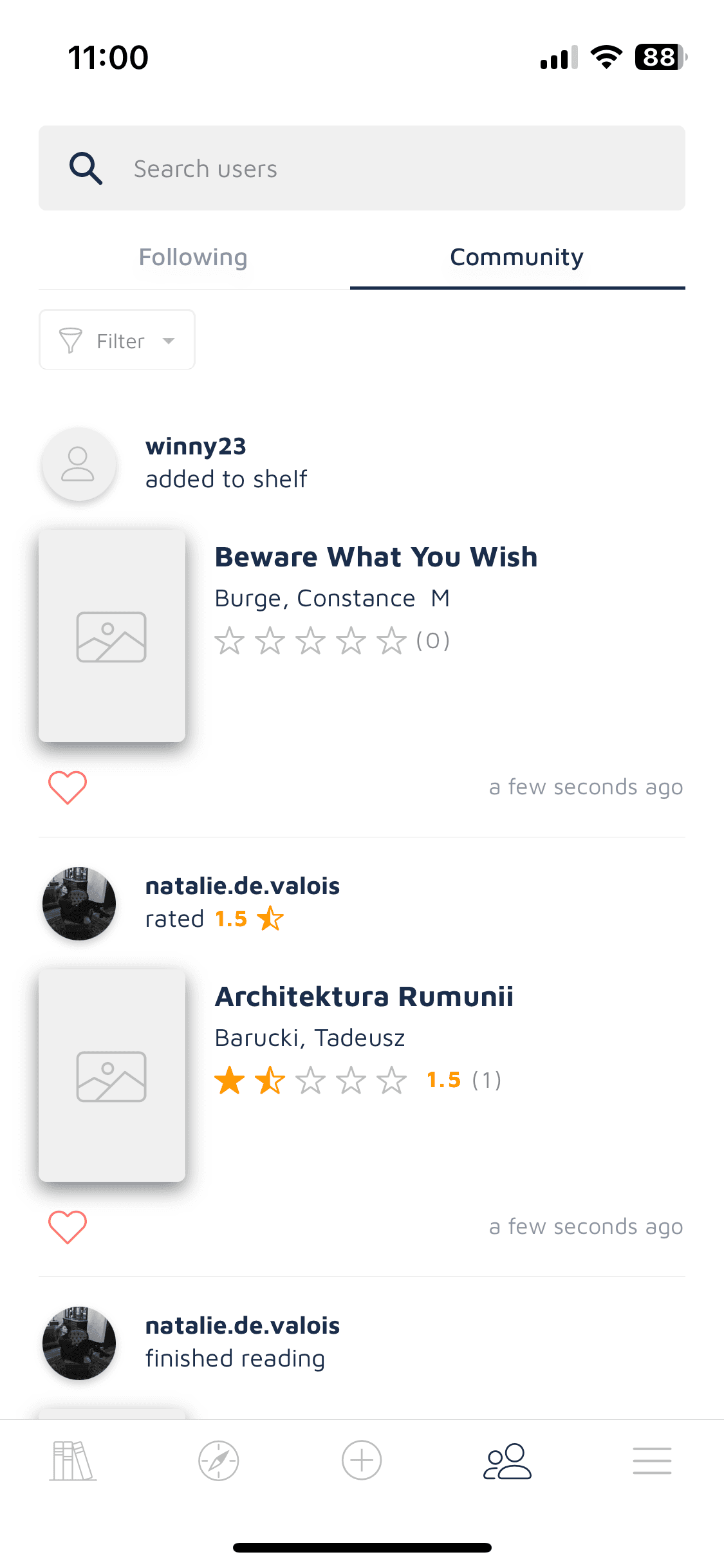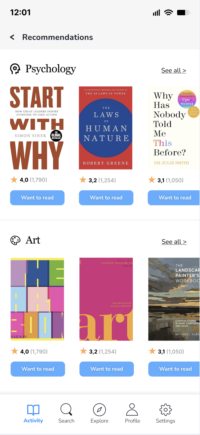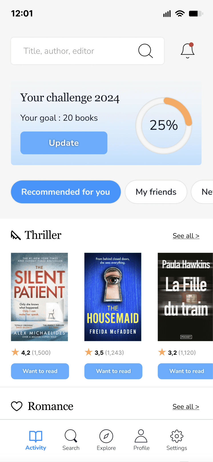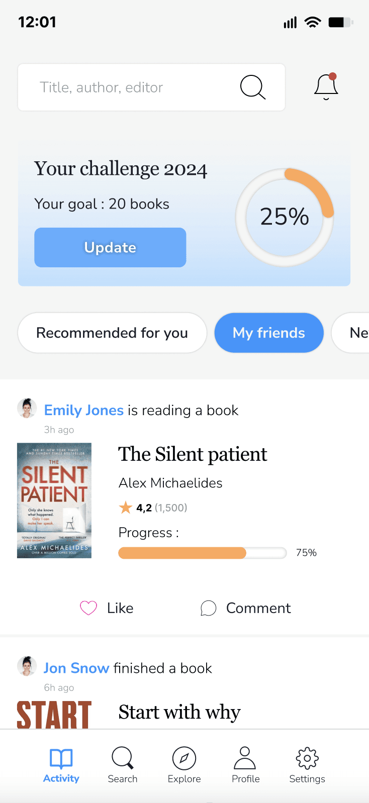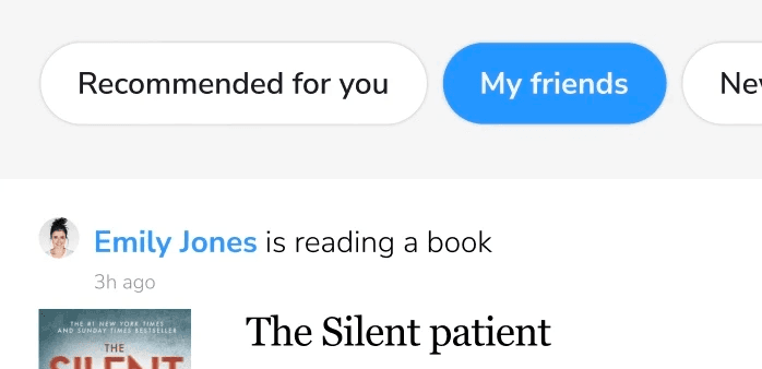 The activity feed : I felt the content was too mixed up with either recommended books, or friends’ activity. So I decided to structure it better and introduce category tags to allow the user filter the content, depending on what they would like to see: recommended books, friends activity, new / trending books and best sellers.