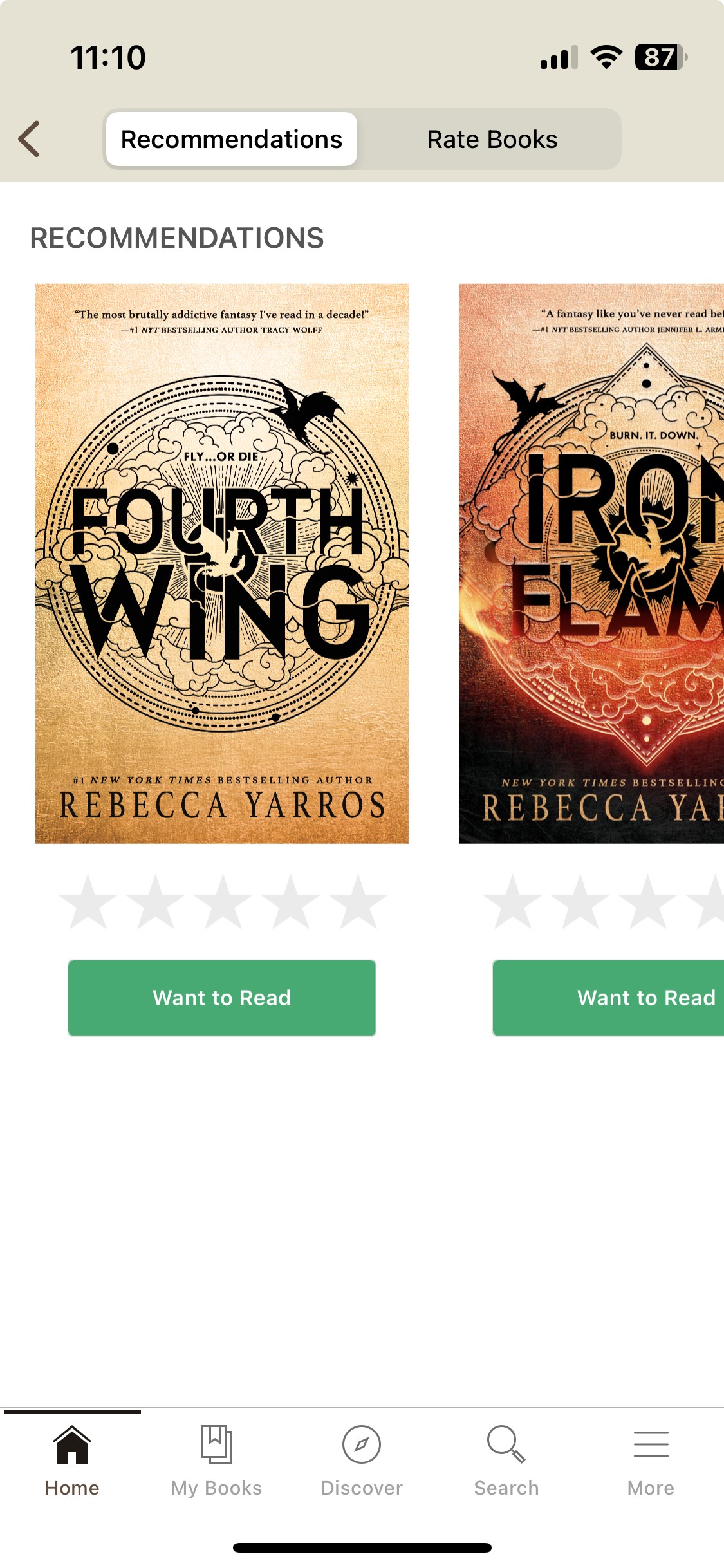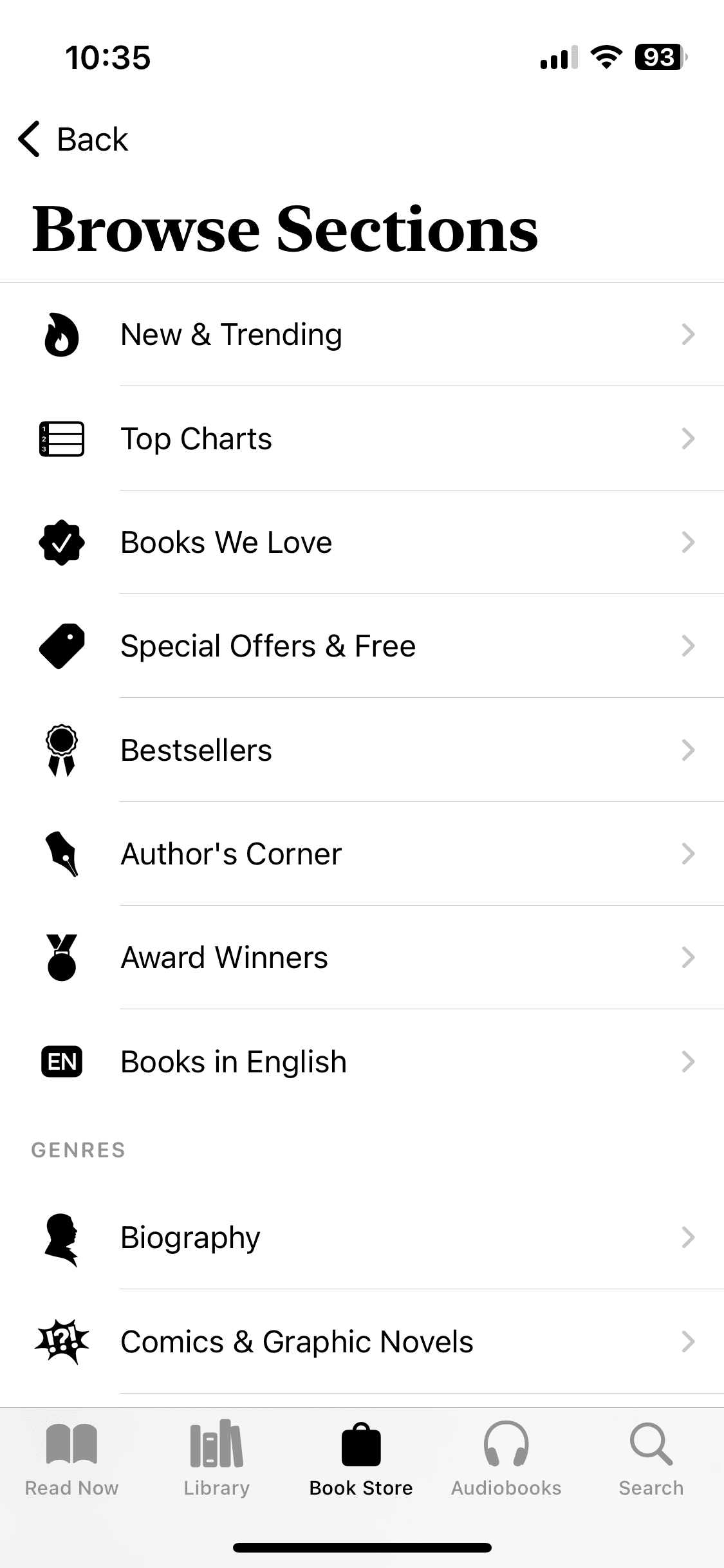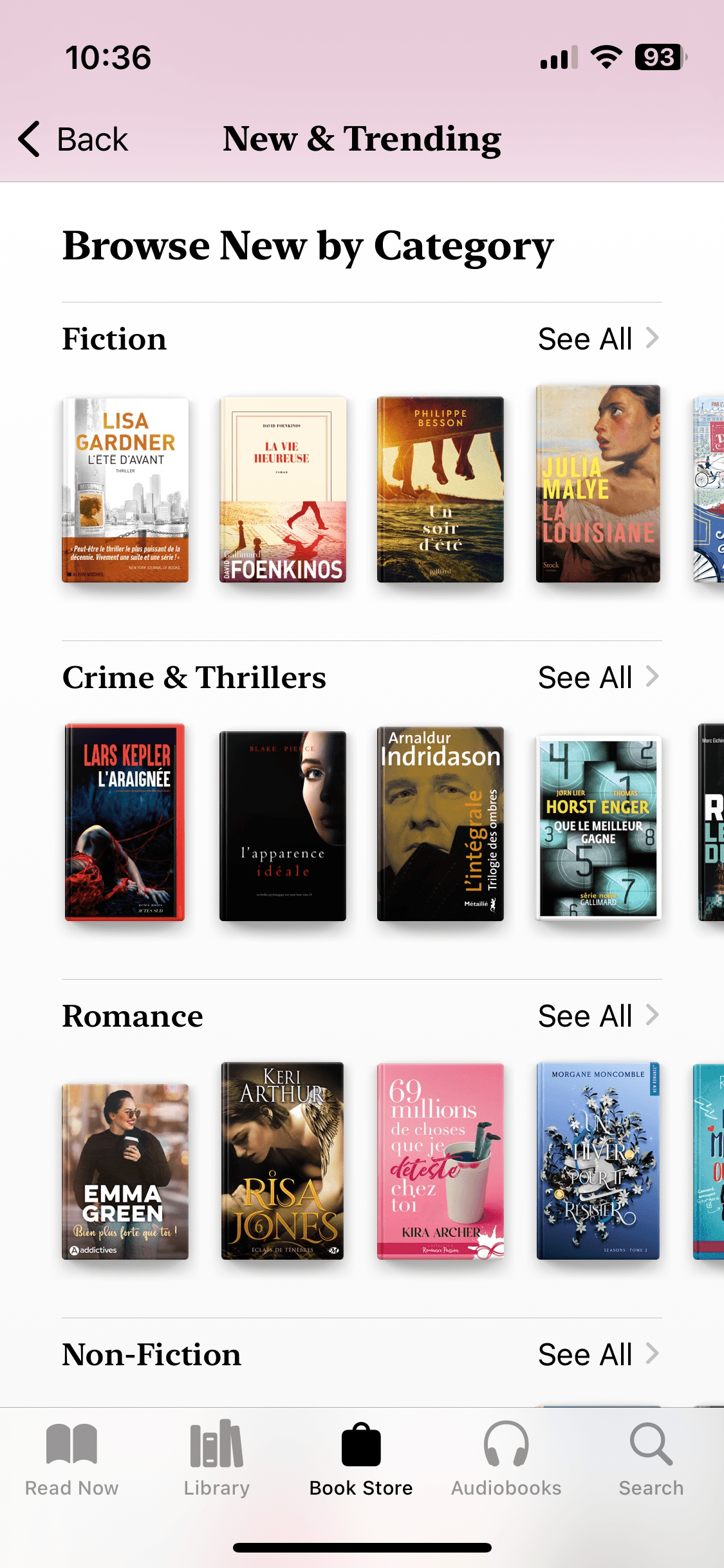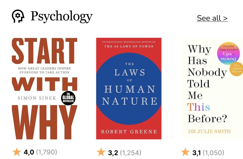 The recommendations screens : I chose to make the genre categories clearer and created sections with a book selection of the given genre and the possibility to see all books from this genre. Then, I simplified the rating render and gave users an indication of the global rating and the number of votes.